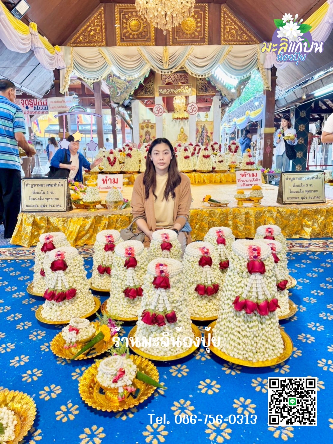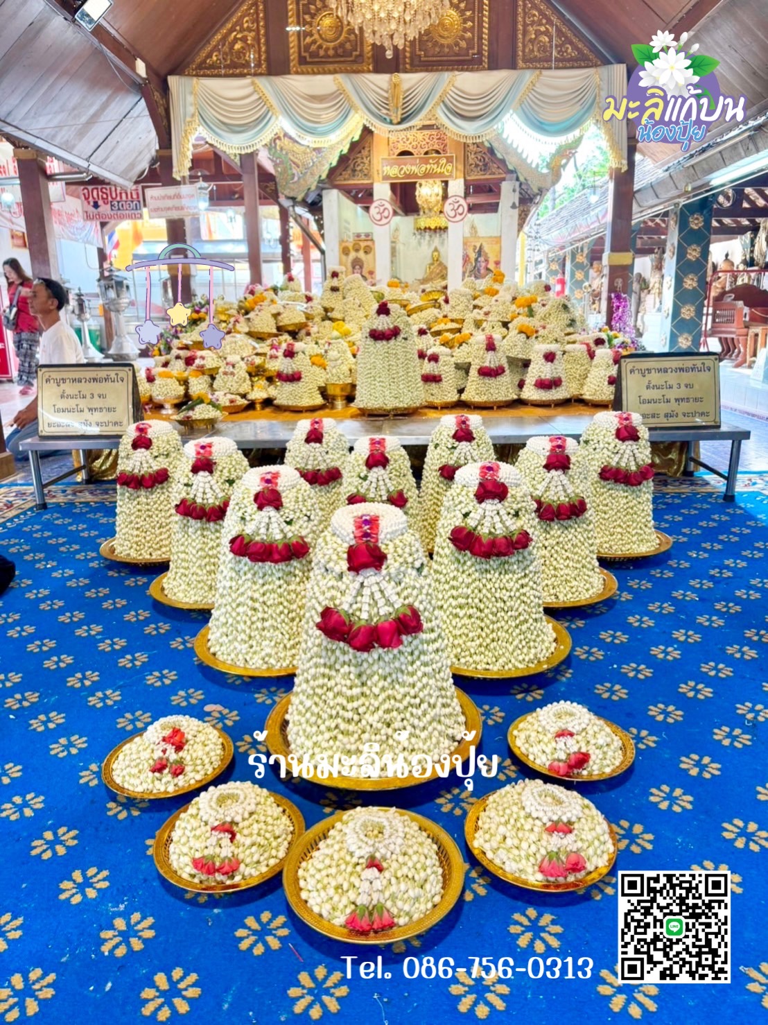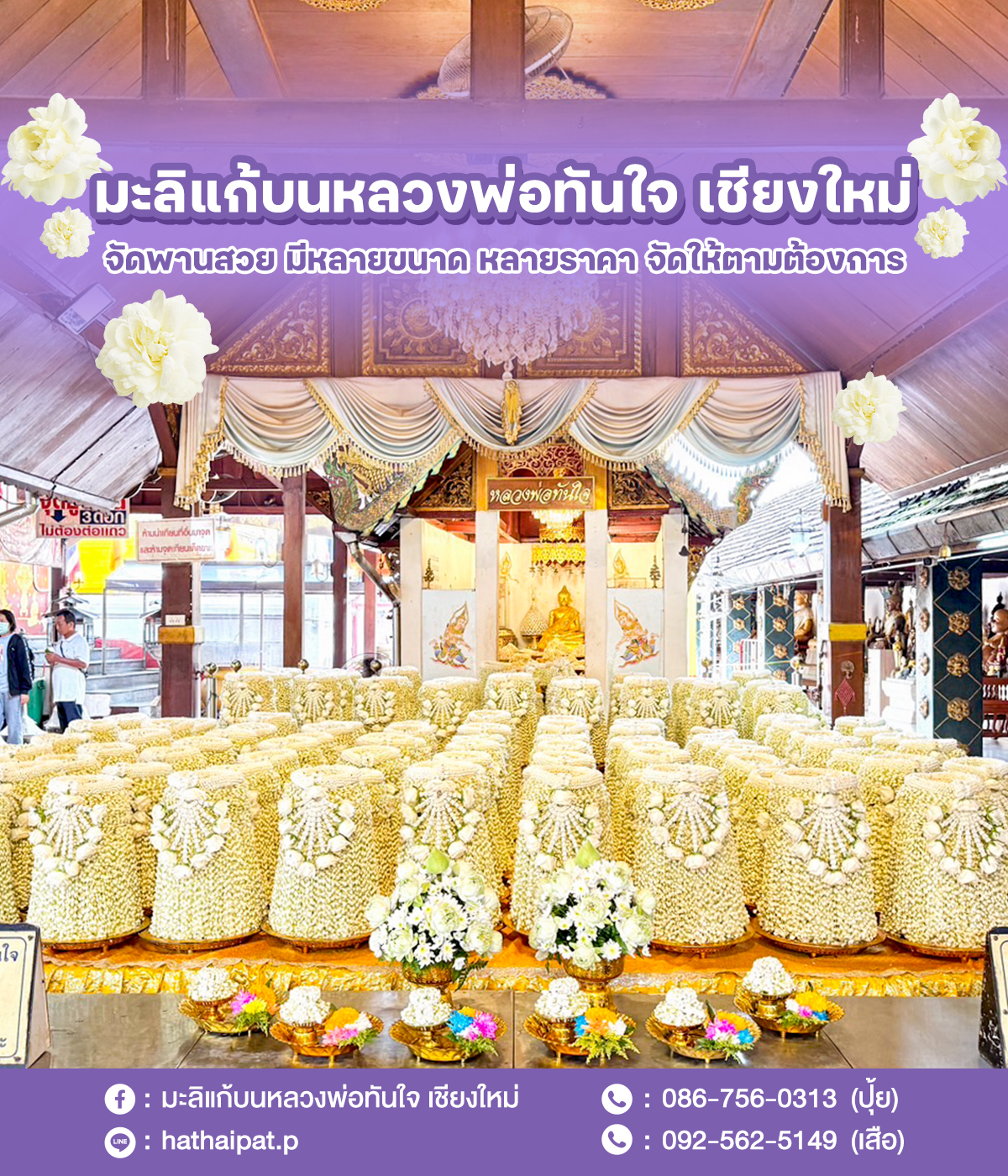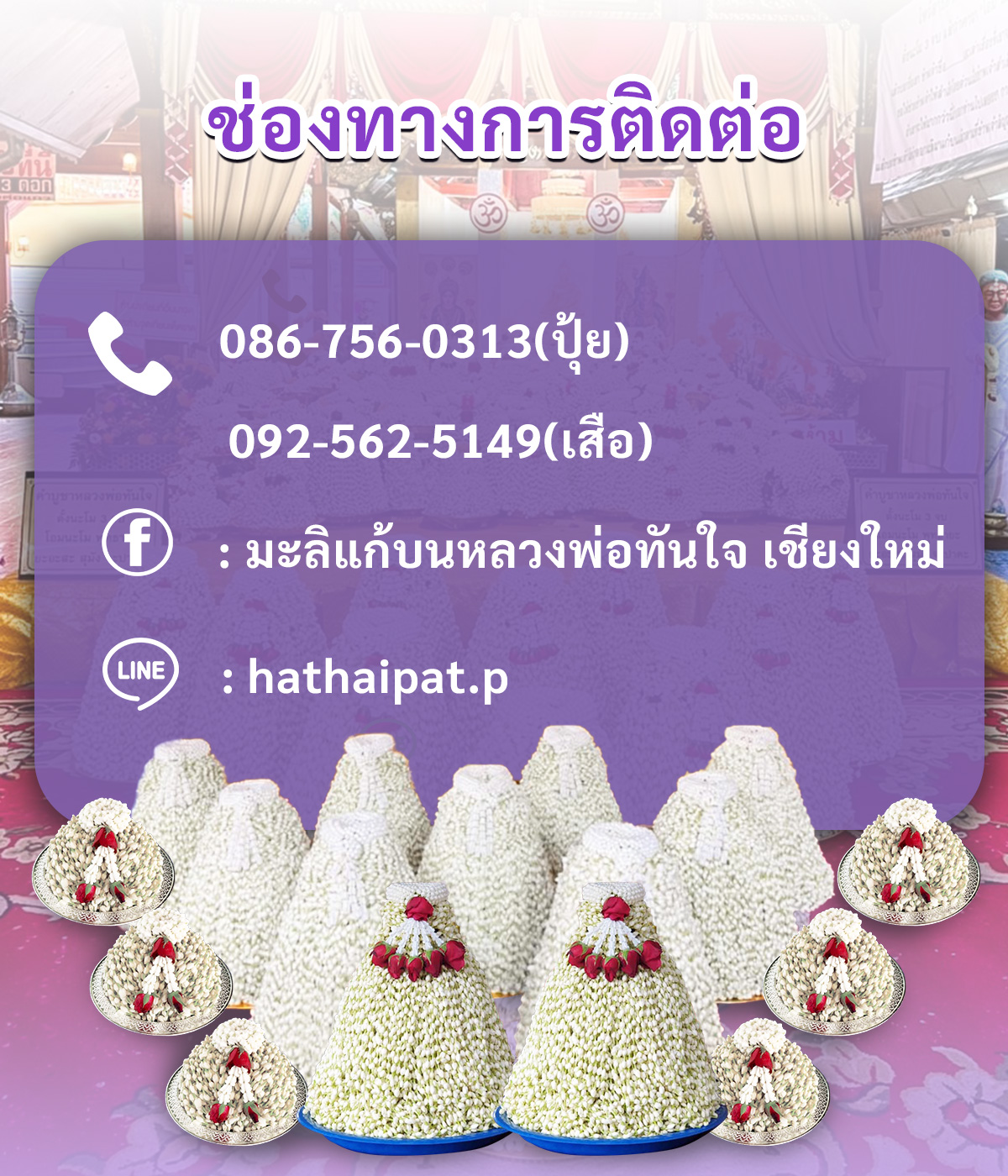 Tel. 086-756-0313 (น้องปุ้ย) Tel. 092-562-5149 (น้องเสือ) Facebook fanpage : มะลิแก้บนหลวงพ่อทันใจ เชียงใหม่