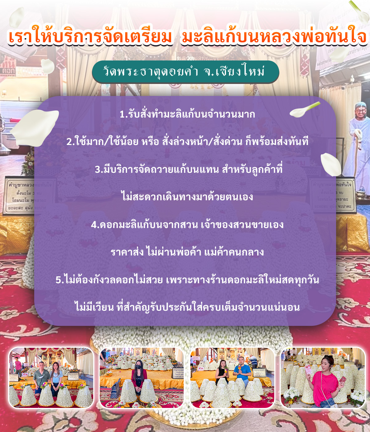 ✔ ดอกมะลิแท้ จัดใหม่ทุกวัน ✔ ส่งงานไว พร้อมหลักฐานจริง ✔ รับงานทั่วประเทศ ลูกค้าต่างจังหวัดใช้บริการได้ ✔ มั่นใจ โปร่งใส ตรวจสอบได้